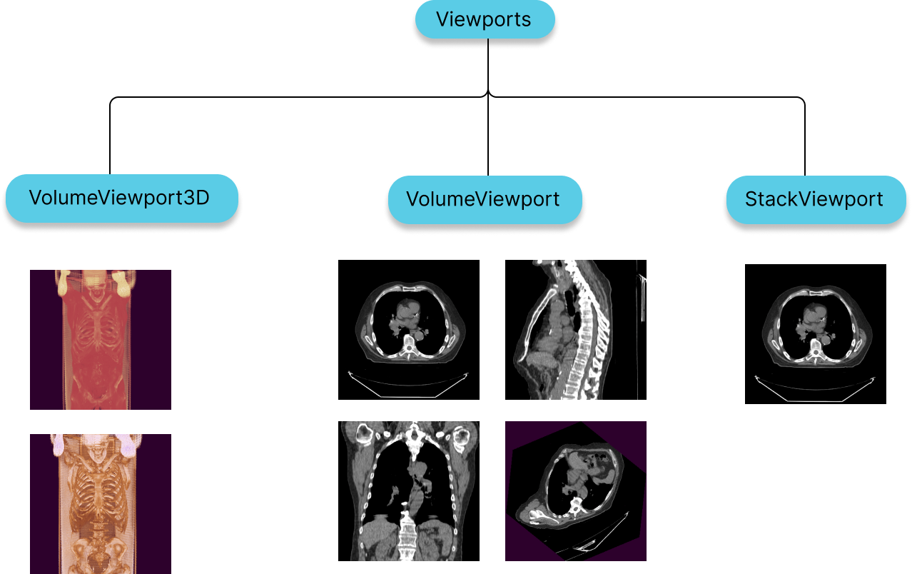 • Having a VolumeViewport enables Multi-planar reformation or reconstruction (MPR) by design, in which you can visualize the volume from various different orientations without addition of performance costs.
